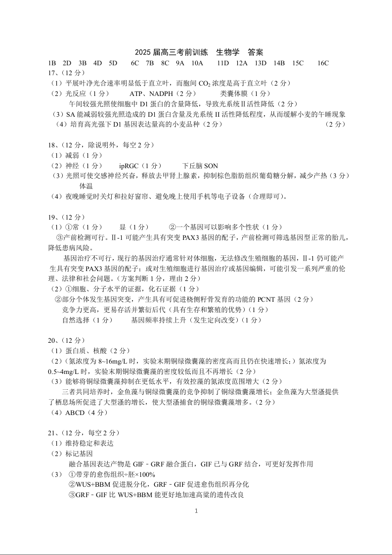 广东省实验中学2025届下学期高考前热身训练生物答案