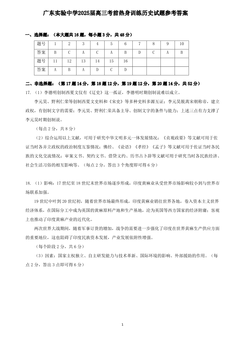 广东省实验中学2025届下学期高考前热身训练历史答案