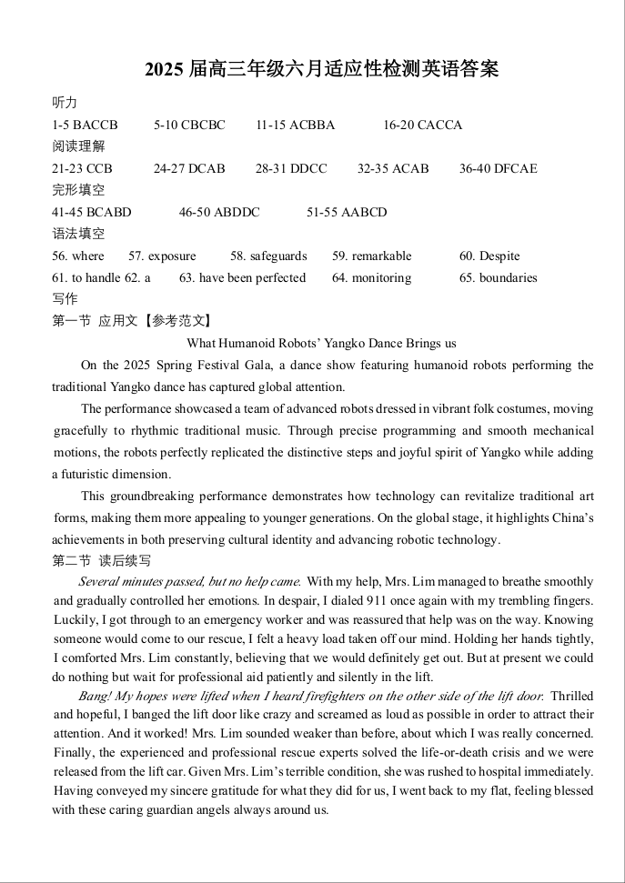 湖北省荆市州沙市中学2025届高三六月适应性检测英语答案