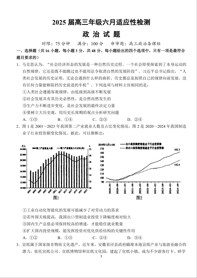 湖北省荆市州沙市中学2025届高三六月适应性检测政治+答案
