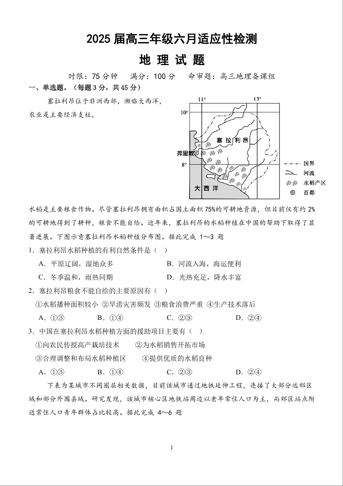 湖北省荆市州沙市中学2025届高三六月适应性检测地理+答案