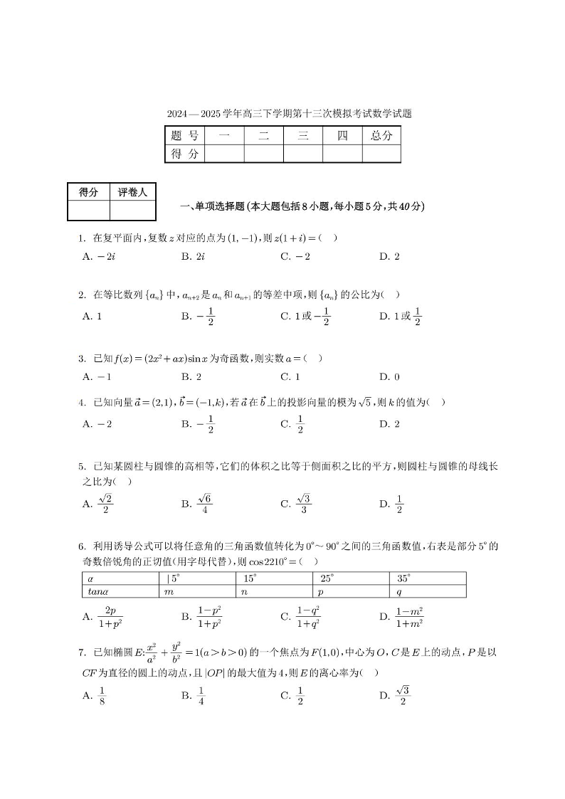 西北工业大学附属中学2025届下学期高三第十三次模拟考试数学+答案