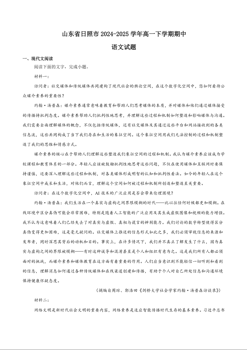 山东省日照市2024-2025学年下学期高一期中校际联合考试语文+答案