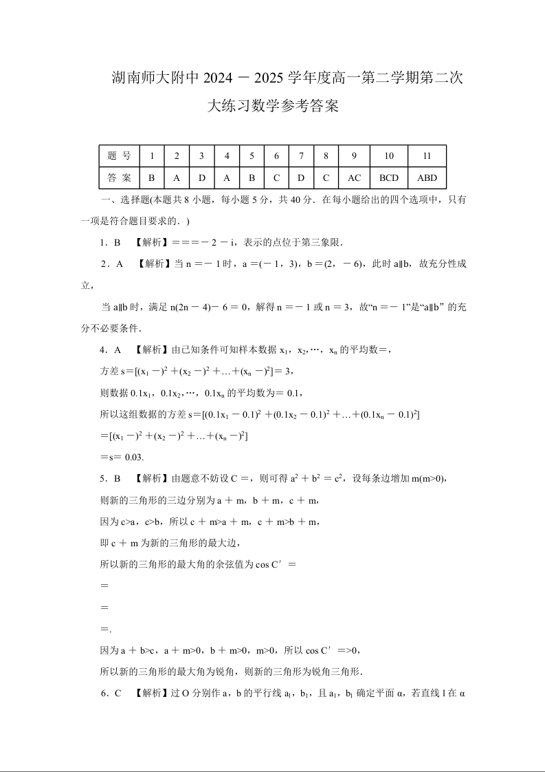 湖南省师大附中2024-2025学年下学期5月高一月考数学答案