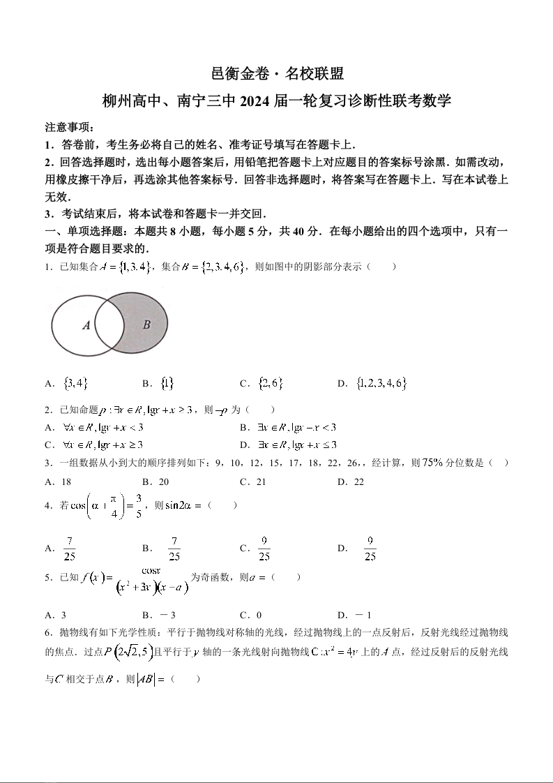 广西2024届邕衡金卷柳州高中、南宁三中高三一轮复习诊断性联考数学(原卷版)