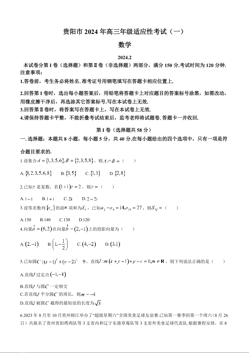 贵州省贵阳市2024届高三年级适应性考试(一)数学+答案