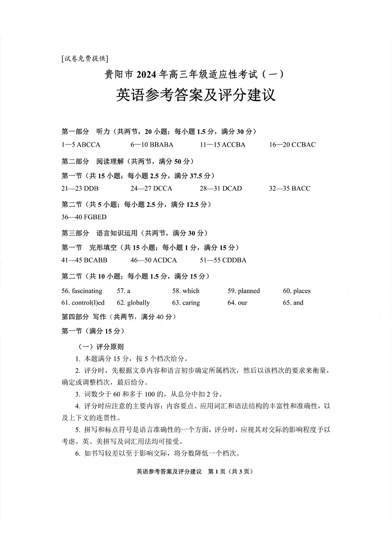 贵州省贵阳市2024届高三年级适应性考试(一)英语答案