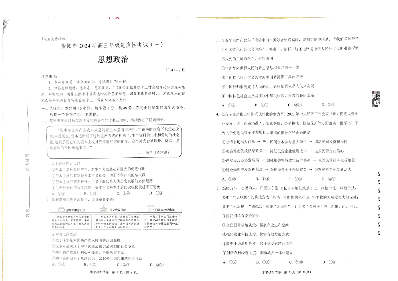 贵州省贵阳市2024届高三年级适应性考试(一)政治