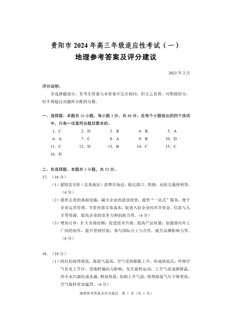 贵州省贵阳市2024届高三年级适应性考试(一)地理答案