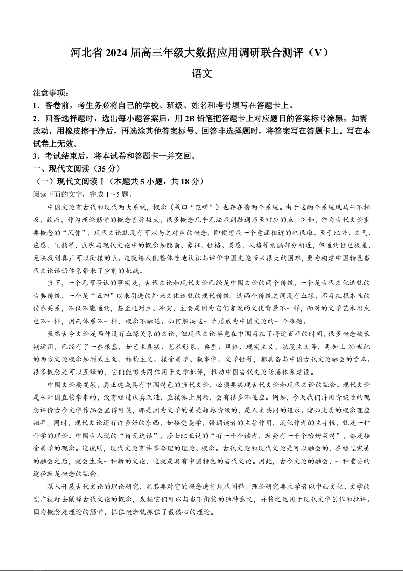 河北省大数据应用调研联合测评2024届高三下学期2月月考语文+答案