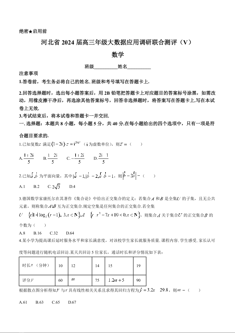 河北省大数据应用调研联合测评2024届高三下学期2月月考数学+答案