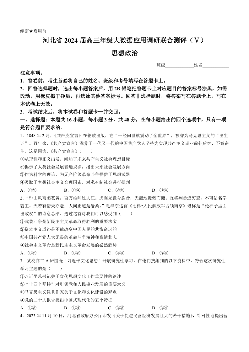 河北省大数据应用调研联合测评2024届高三下学期2月月考政治+答案