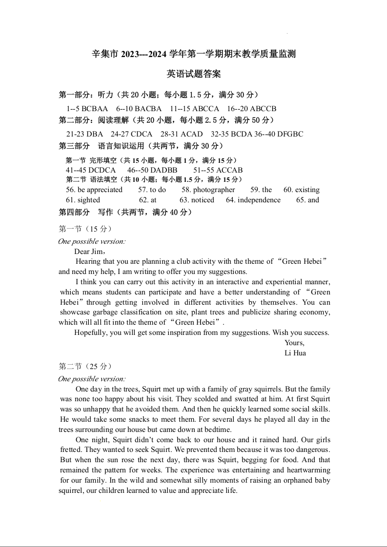 河北省石家庄市辛集市2024届高三上学期2月期末英语答案