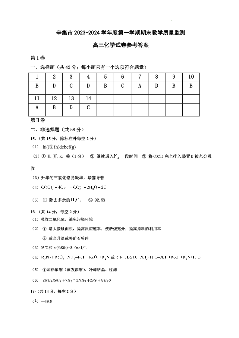 河北省石家庄市辛集市2024届高三上学期2月期末化学答案