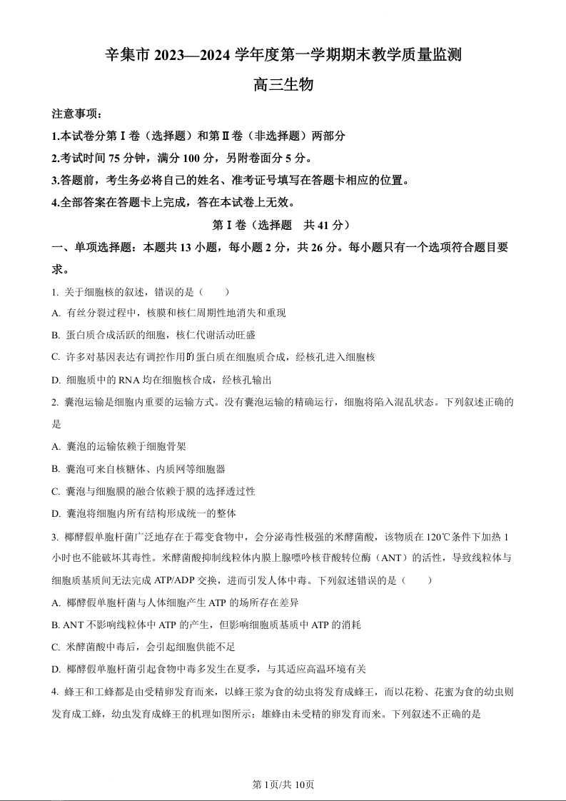 河北省石家庄市辛集市2024届高三上学期2月期末生物(原卷版)