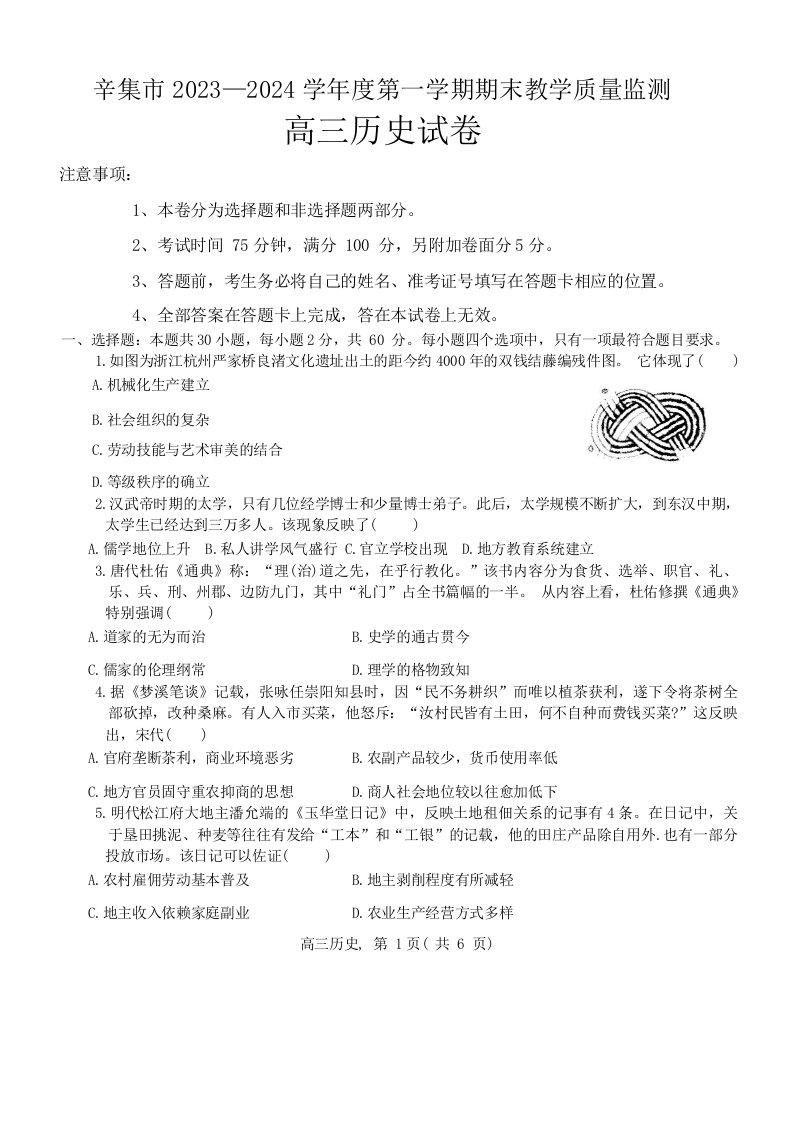 河北省石家庄市辛集市2024届高三上学期2月期末历史