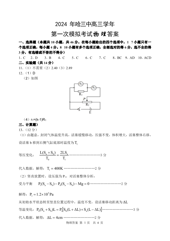 黑龙江省哈尔滨市2024届第三中学校高三下学期第一次模拟考试物理答案
