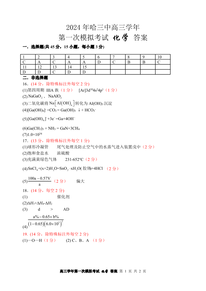 黑龙江省哈尔滨市2024届第三中学校高三下学期第一次模拟考试化学答案