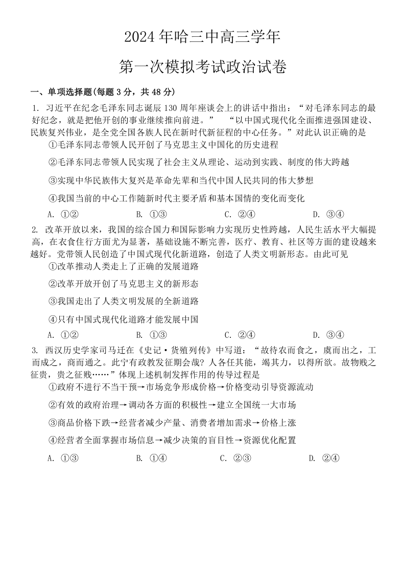 黑龙江省哈尔滨市2024届第三中学校高三下学期第一次模拟考试政治