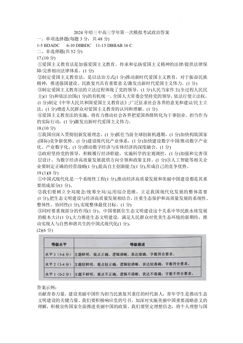 黑龙江省哈尔滨市2024届第三中学校高三下学期第一次模拟考试政治答案