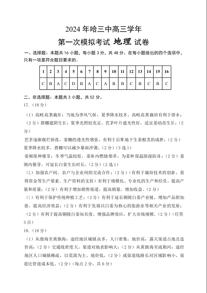 黑龙江省哈尔滨市2024届第三中学校高三下学期第一次模拟考试地理答案