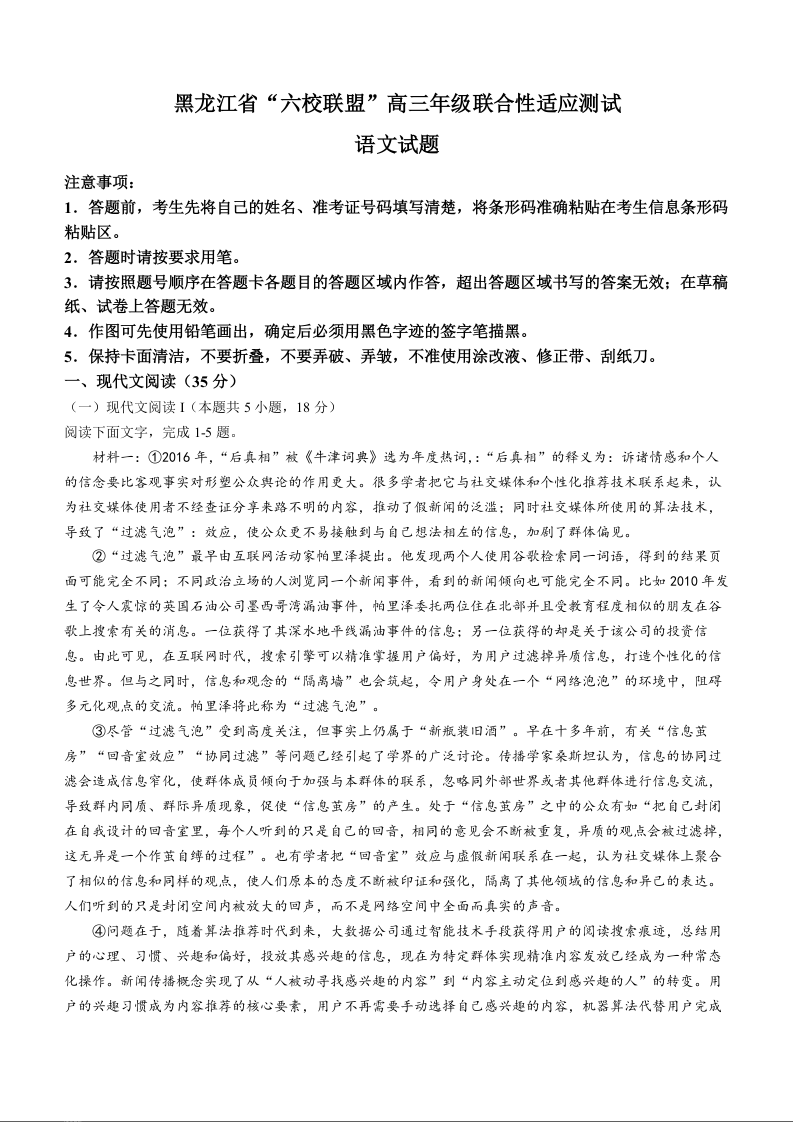 黑龙江省六校联盟2024届高三下学期联合性适应测试语文+答案
