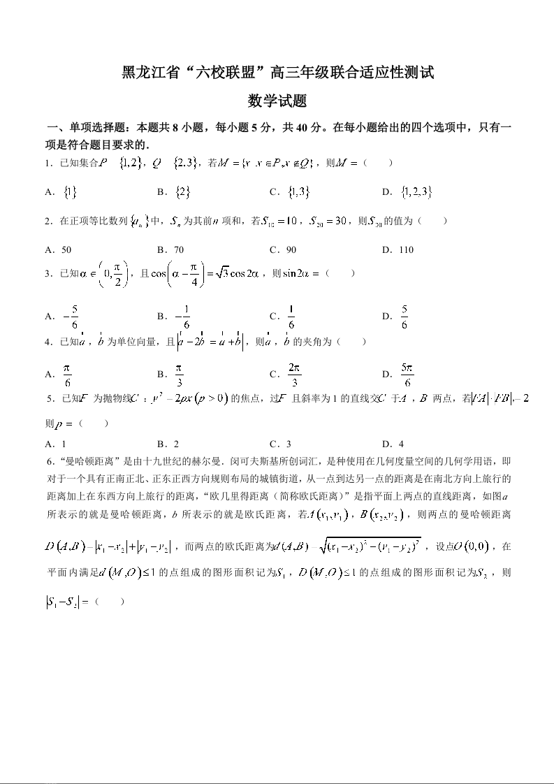 黑龙江省六校联盟2024届高三下学期联合性适应测试数学+答案