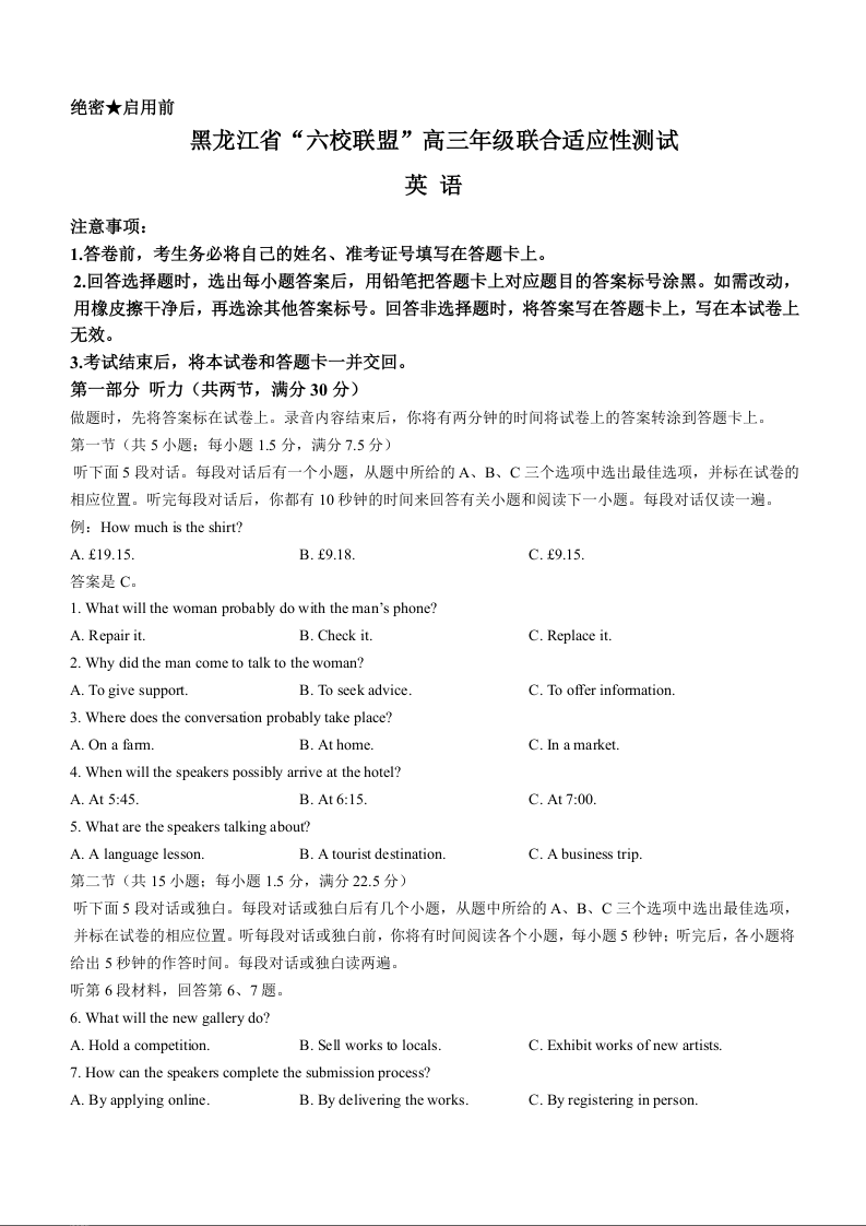 黑龙江省六校联盟2024届高三下学期联合性适应测试英语