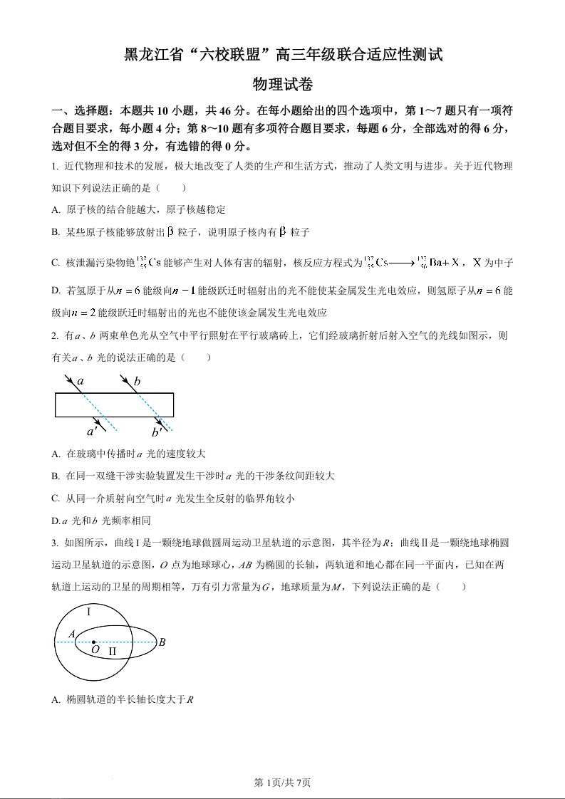 黑龙江省六校联盟2024届高三下学期联合性适应测试物理(原卷版)
