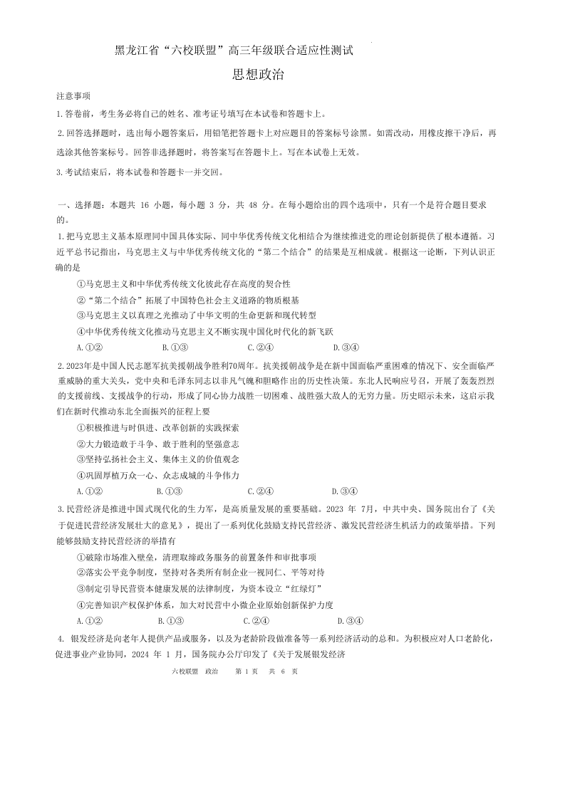 黑龙江省六校联盟2024届高三下学期联合性适应测试政治