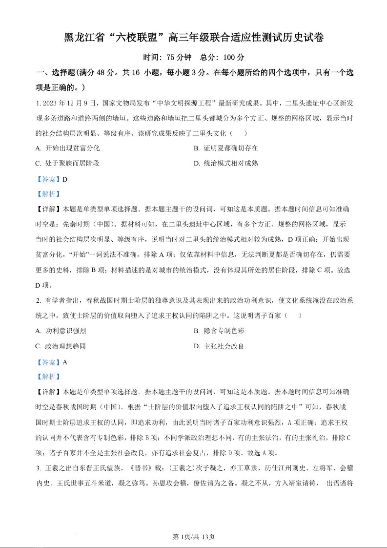黑龙江省六校联盟2024届高三下学期联合性适应测试历史(精品解析版)