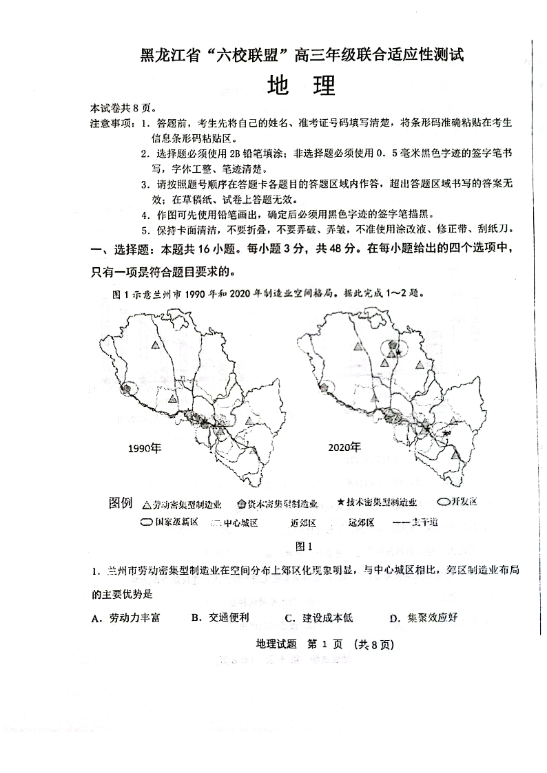 黑龙江省六校联盟2024届高三下学期联合性适应测试地理+答案