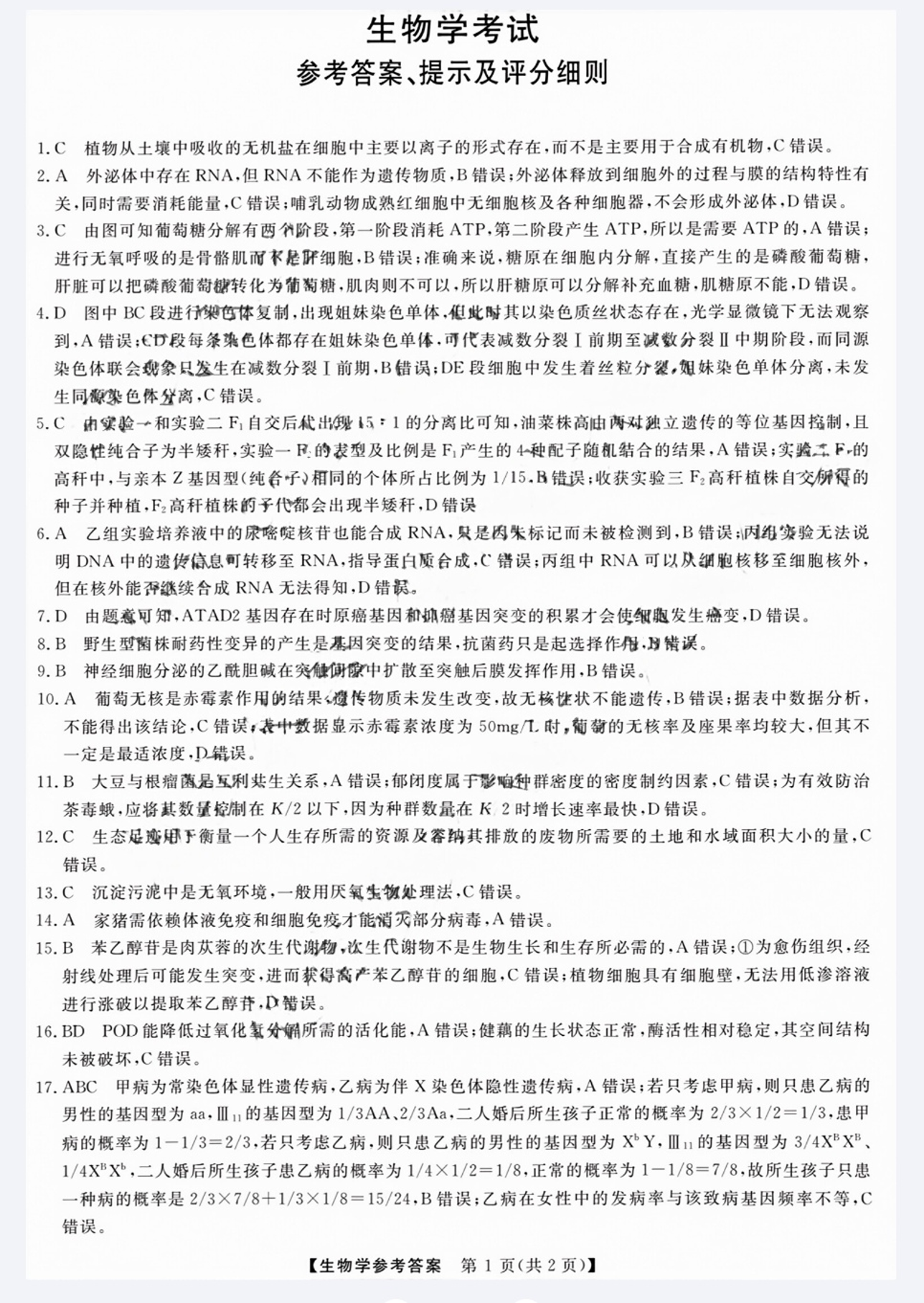 黑龙江省齐齐哈尔市2024届高三下学期一模生物答案