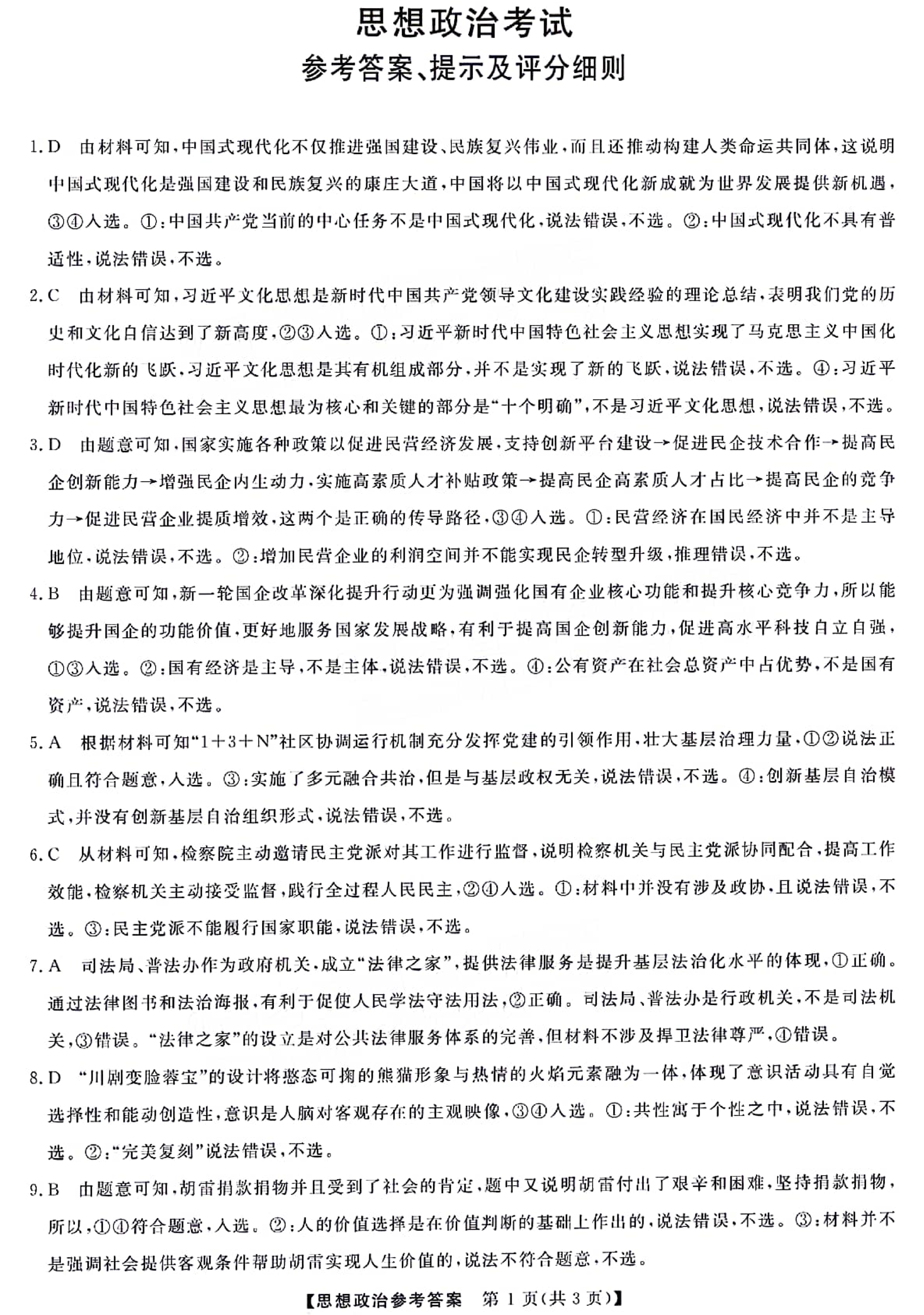 黑龙江省齐齐哈尔市2024届高三下学期一模政治答案