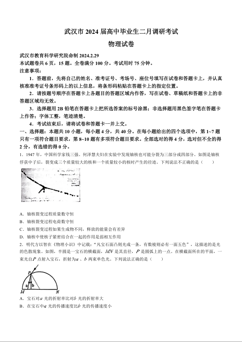湖北省武汉市2024届高三二月调研考试物理