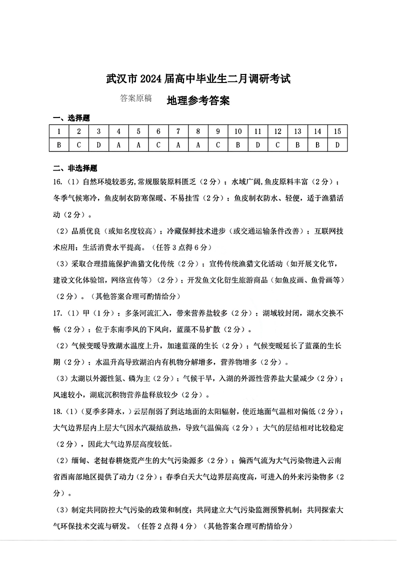 湖北省武汉市2024届高三二月调研考试地理答案