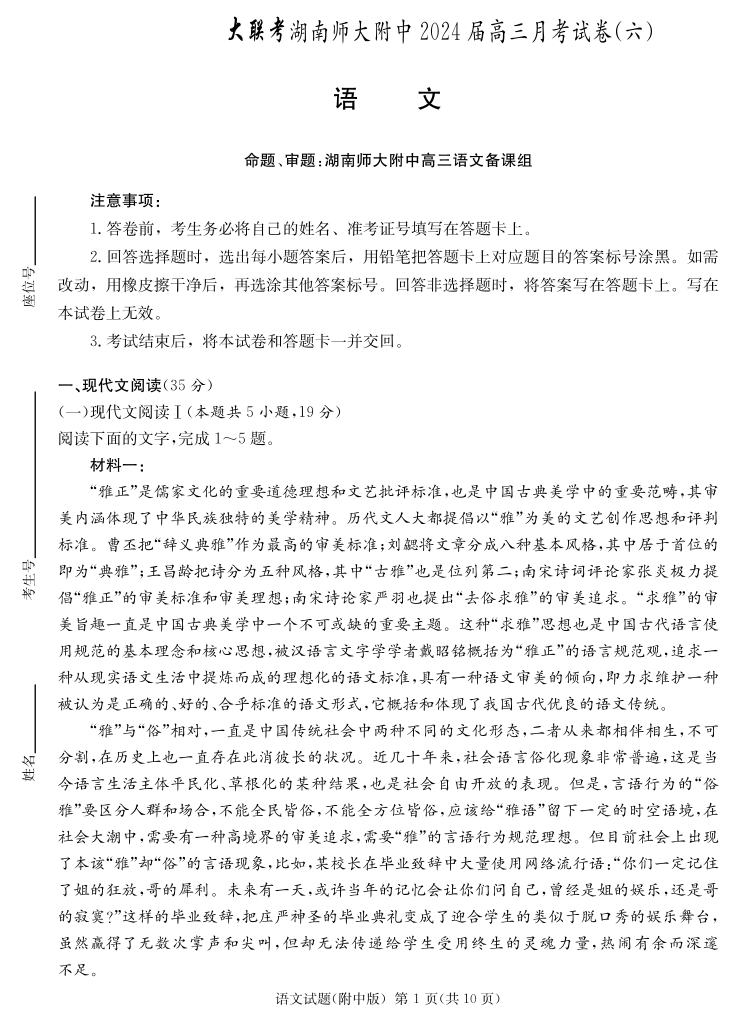湖南师范大学附属中学2024届高三下学期月考(六)语文