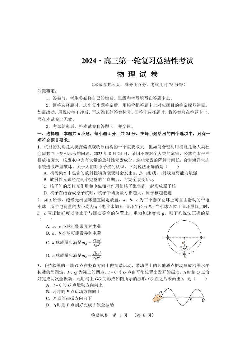 湖南省2024届高三下学期一轮复习总结性考试物理