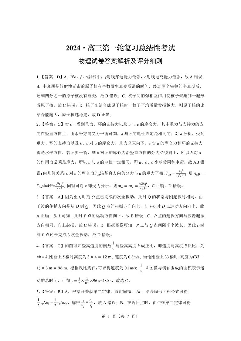湖南省2024届高三下学期一轮复习总结性考试物理答案