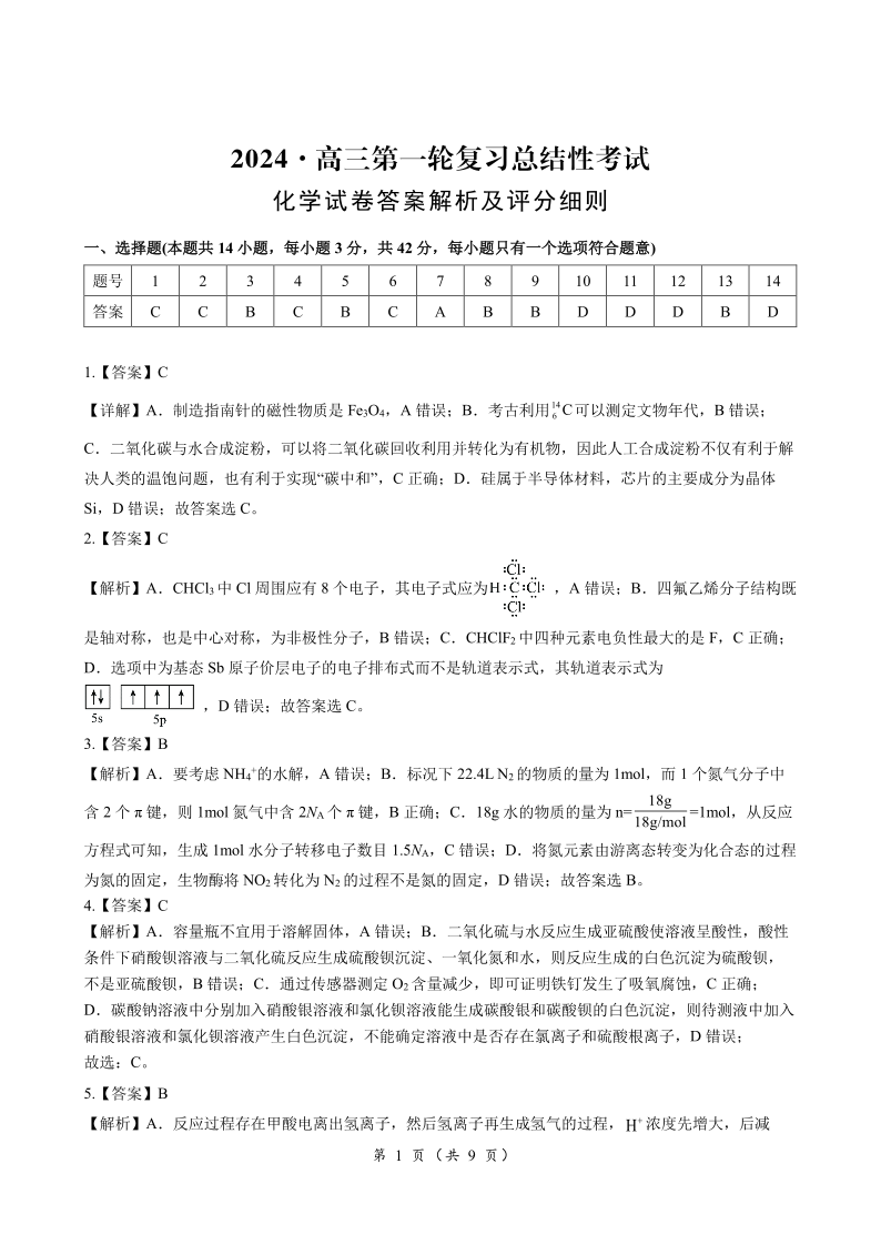 湖南省2024届高三下学期一轮复习总结性考试化学答案