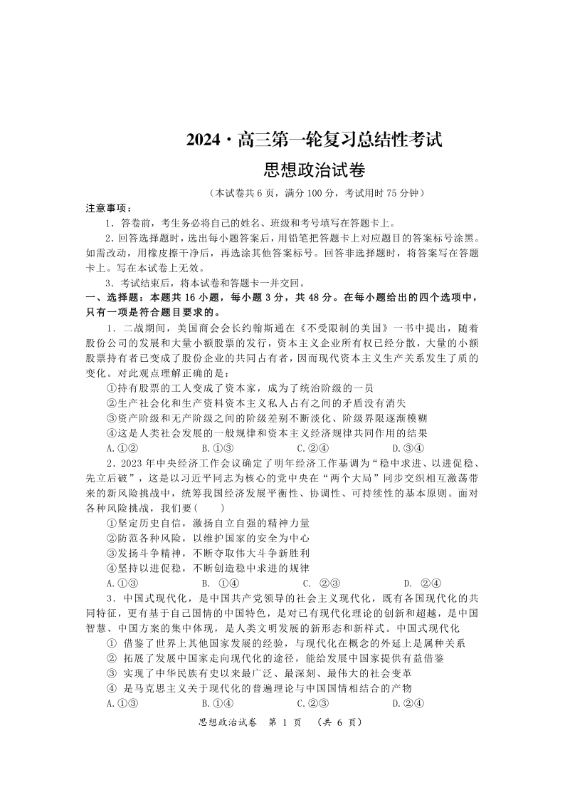 湖南省2024届高三下学期一轮复习总结性考试政治