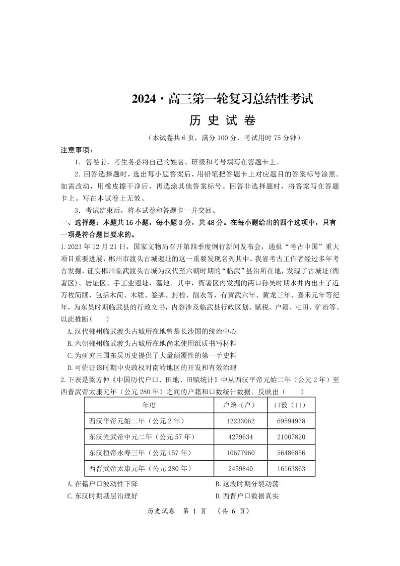 湖南省2024届高三下学期一轮复习总结性考试历史