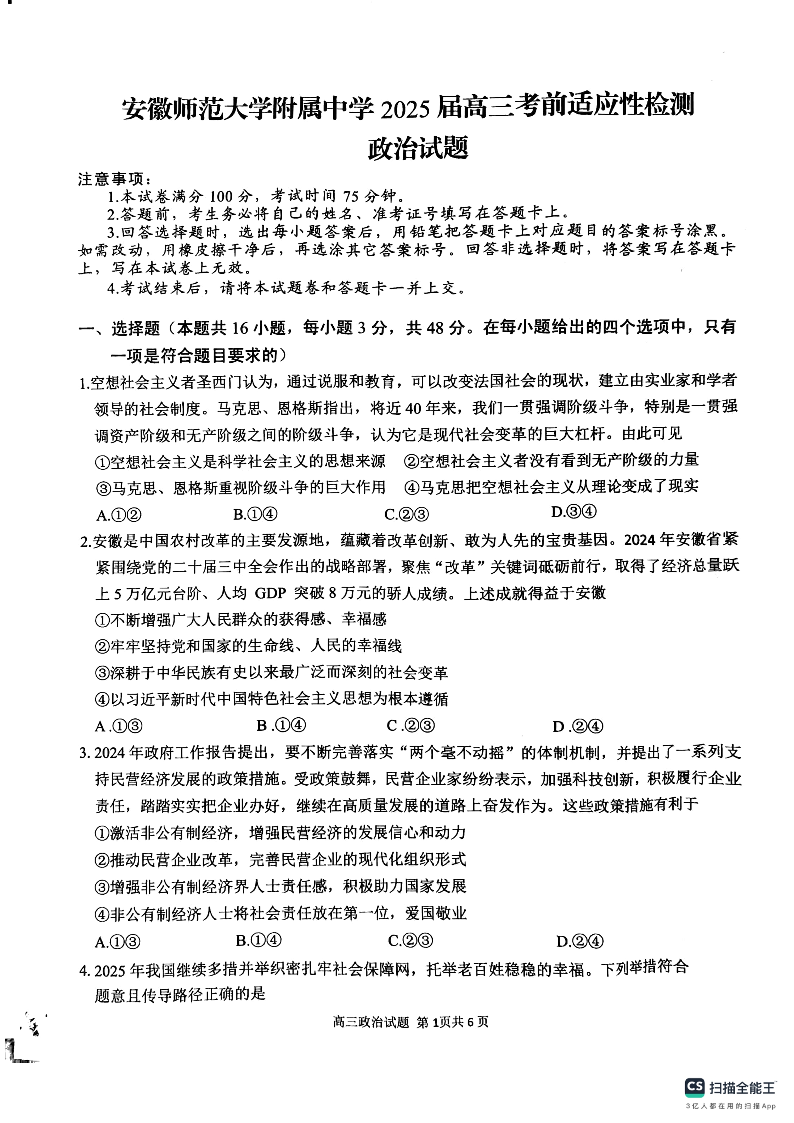 安徽省师大附中2025届下学期5月高三考前适应性检测政治+答案