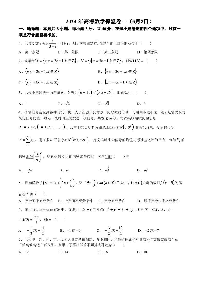 湖南省长沙市长郡中学2025届高三下学期保温卷(一)数学+答案
