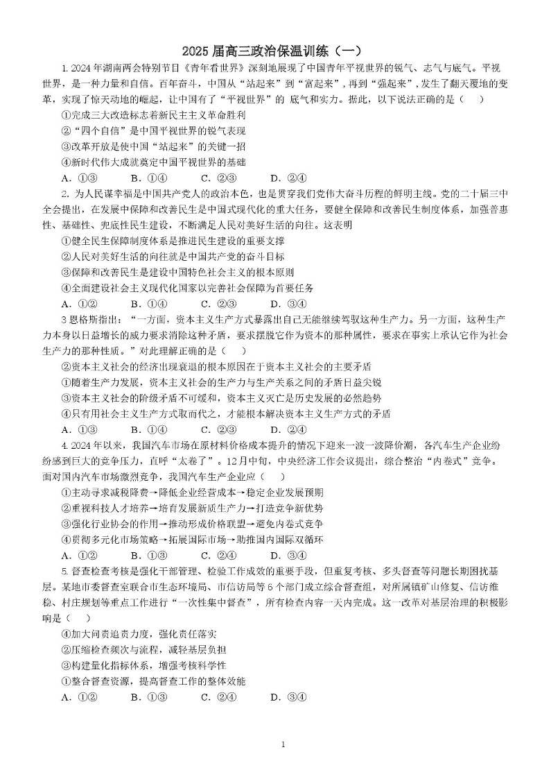 湖南省长沙市长郡中学2025届高三下学期保温卷(一)政治+答案