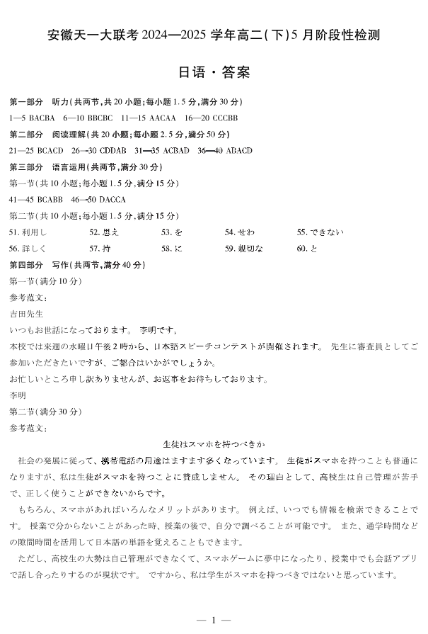 安徽省区域高中2024-2025学年下学期5月高二阶段性检测日语答案