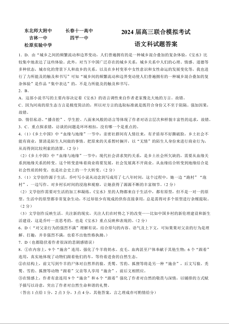 吉林省东北师大附中、长春市十一高中、吉林一中、四平一中、松原实验中学2024届高三上学期1月联合模拟考试语文答案