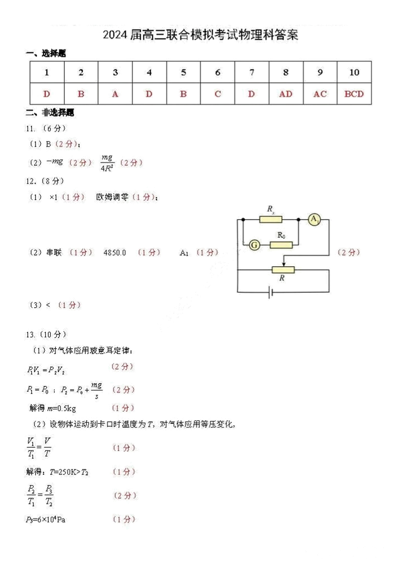 吉林省东北师大附中、长春市十一高中、吉林一中、四平一中、松原实验中学2024届高三上学期1月联合模拟考试物理答案