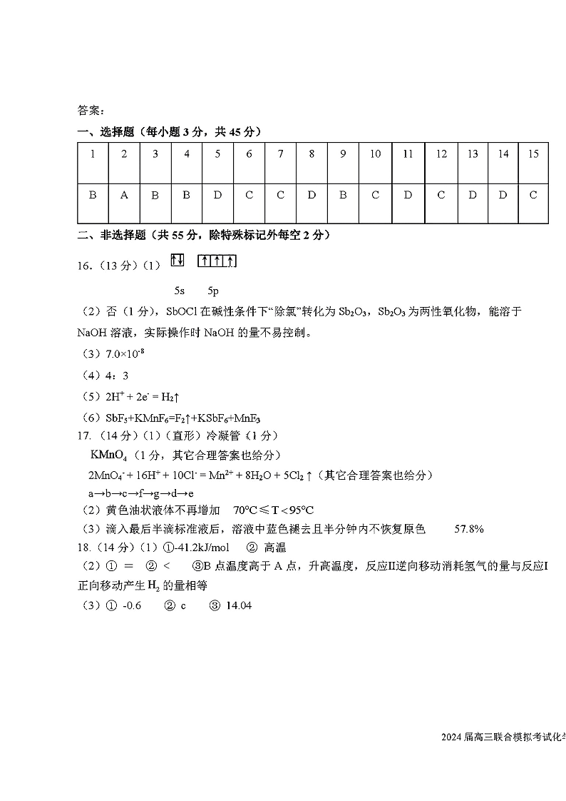 吉林省东北师大附中、长春市十一高中、吉林一中、四平一中、松原实验中学2024届高三上学期1月联合模拟考试化学答案