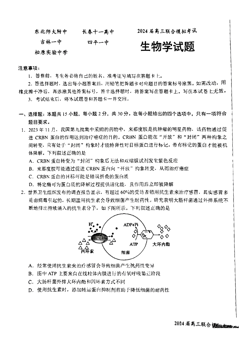 吉林省东北师大附中、长春市十一高中、吉林一中、四平一中、松原实验中学2024届高三上学期1月联合模拟考试生物+答案